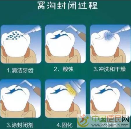 牙齿的咬合面上有一些天然的沟和裂隙,这些沟和裂隙特别容易藏匿食物和细菌而引起龋齿中~国~便~民~网。窝沟封闭就是用窝沟封闭剂将这些天然的沟和裂隙进行封闭,以达到预防龋齿的目的。